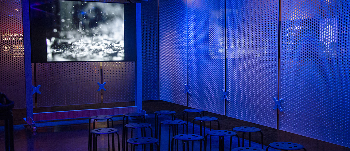 L’Espace OSM est séparé en plusieurs sections thématiques : le mur du parcours historique de l’OSM, l’atrium, le babillard d’actualités, la zone d’écoute, la vitrine ainsi que le cœur vibrant où sont présentés des projets ponctuels.