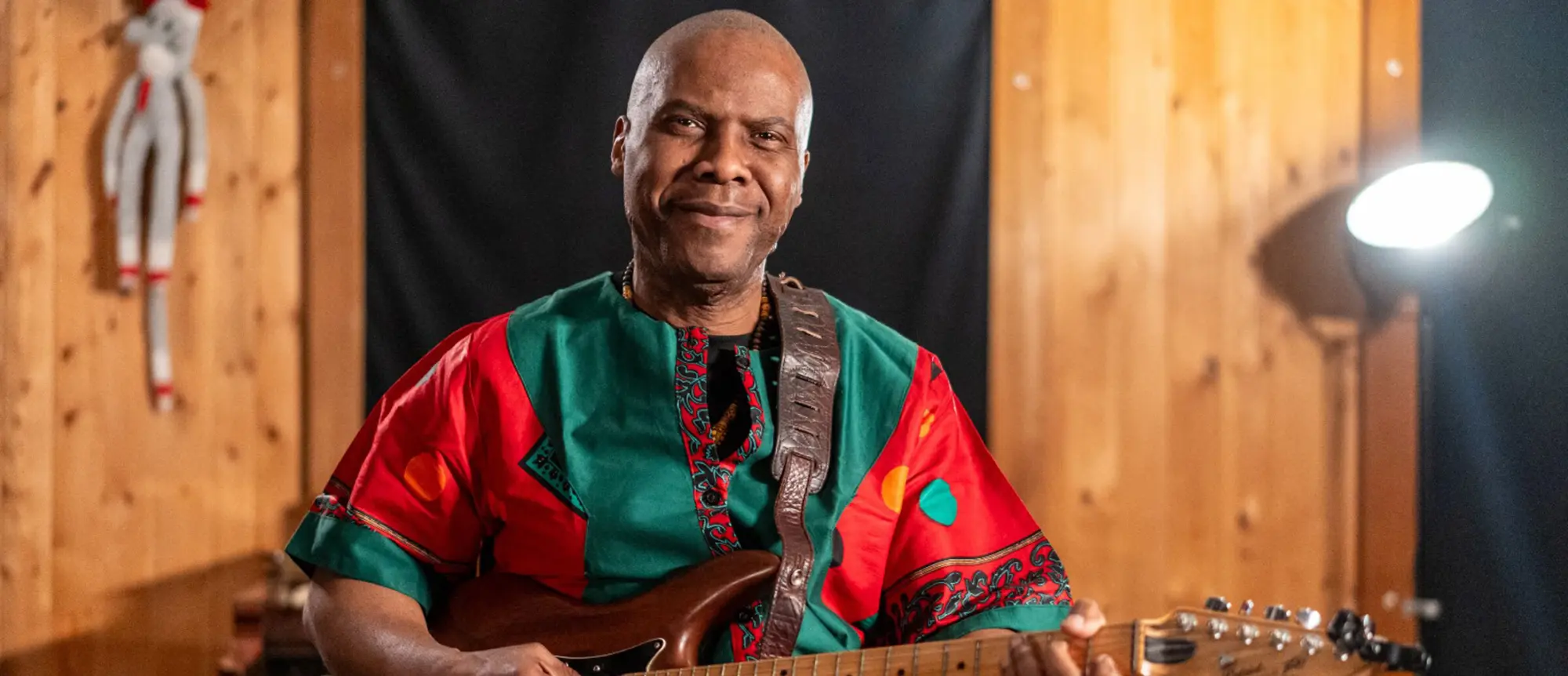 Multi-instrumentalist, singer, guitarist, public speaker, sound therapy specialist, and master Nkuu drum player — Atna Njock Zekuhl — on stage with 19 musicians.