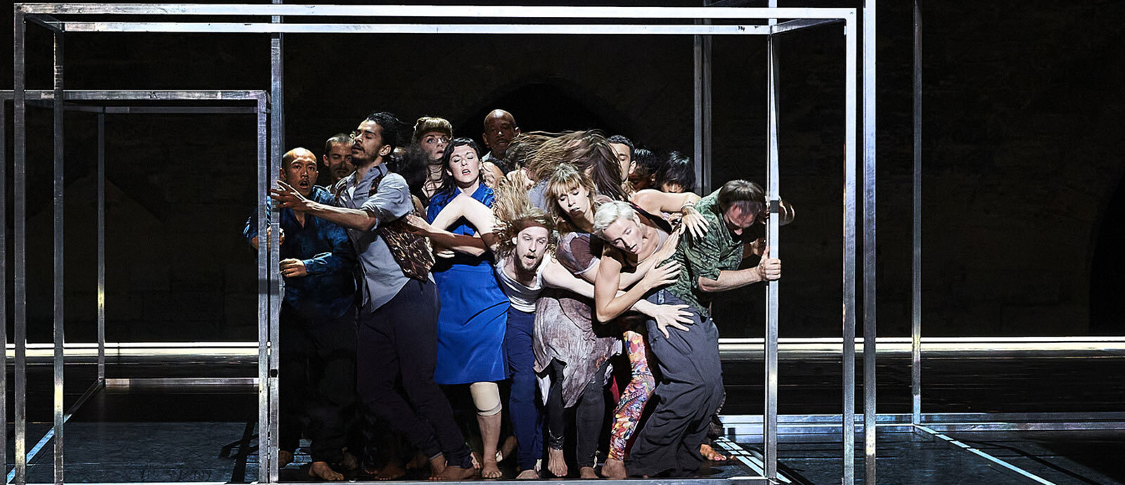 Created especially for the 2016 Avignon Festival and filmed in the Court of Honour of the Papal Palace, Babel 7.16 is an update/recreation of Babel(words), the emblematic piece created by Cherkaoui and Jalet in 2010. Babel 7.16 borrows its title and its tone from the book of Genesis, which seeks to explain why people are scattered over the earth and why they speak different languages. The two choreographers have brought together 23 dancers from 15 different countries, each defending their culture, their nationality, and their spoken and physical language. Among them is Francis Ducharme, a dancer and actor from Quebec. On stage, singers and musicians take us on a journey of hybrid sounds. They transport us to India with Mahabub Khan and Sattar Khan, to Japan with the Taiko (Shogo Yoshii’s enormous Japanese drums), and to medieval Italy with Gabriele Miracle’s percussion and the voice of soprano Patrizia Bovi. English sculptor Antony Gormley designed the set, which features imposing three-dimensional metal structures that the artists manipulate in full view. From private to public, from intimacy to extroversion, from the individual to the collective: Babel 7.16.