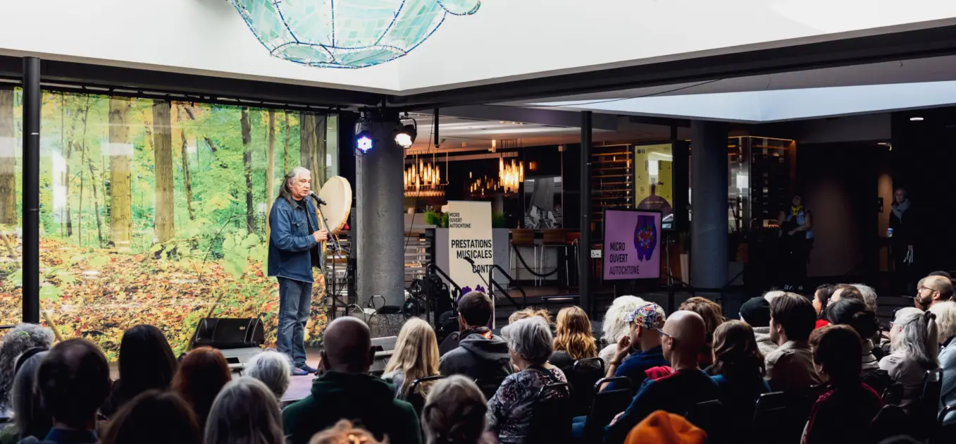 Terminez la journée en beauté en assistant à la cérémonie de clôture animée par Richard Moar, aîné atikamekw, guide spirituel Expédition Premières Nations (EPN), comédien de théâtre, chanteur avec tambour et instigateur de la marche Motetan Mamo, et la sociologue, productrice, scénariste et documentariste abénakise Kim O’Bomsawin.